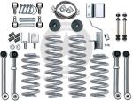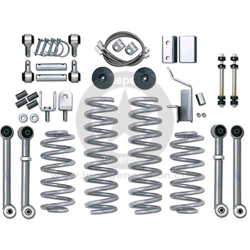 Il kit comprende: molle anteriori e posteriori, tamponi fine corsa, tubi freno aneriori., staffa rilocamento panhard posteriore, disconnects per antirollio anteriore e attacchi prolungati per quella posteriore, braccetti super-flex anteriori e posteriori Inferiori.